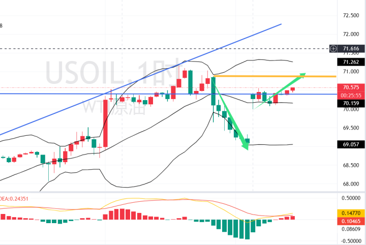 目前来说,短期内主要看原油价格能否上涨到71.3的位置,如果能突破71.3的位置继续上涨,就可以在71.5左右进场看多,止损给到69.9,目标可以看72.2的位置。当然我认为原油收到上方阻力位重新回调的可能性更大,如果有明确的回落信号,就可以目标看到69附近进场做空。