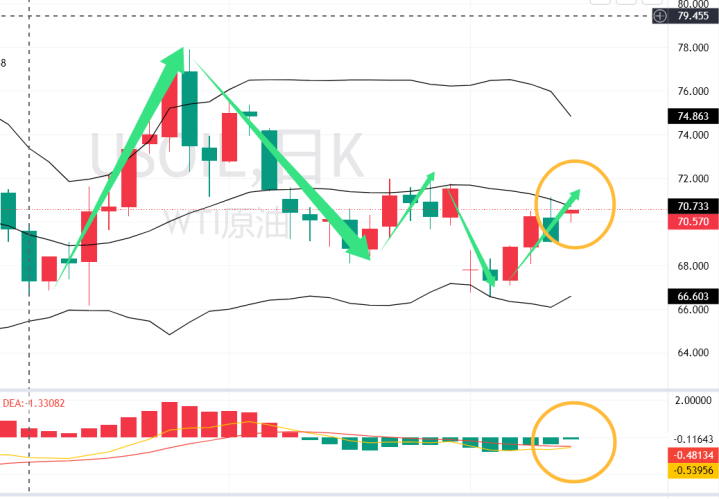 从WTI原油日线图中来看,目前原油价格是处于布林带中轨上,且十分接近前一次回涨的高点71.3,目前主要看未来原油价格能否来到71.3的位置,有没有可能突破71.3继续上行,亦或是收到上方阻力位反弹重新开始回落调整。从MACD线来看,短期内有要形成金叉的趋势,且下跌动能柱有所回缩。