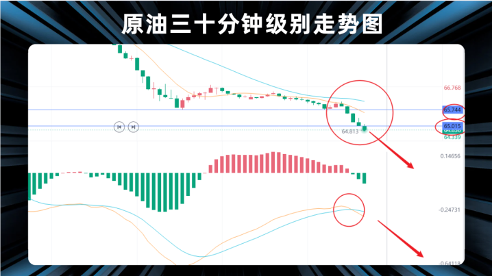 紧接着,来分析原油 30 分钟级别的走势图。原油价格呈现大幅下跌态势,在经历短暂的震荡行情后,跌势重启,再度进入下行通道。目前,原油价格运行于 65.015 支撑位与 65.744 压力位之间,区间内整体呈震荡下行格局。