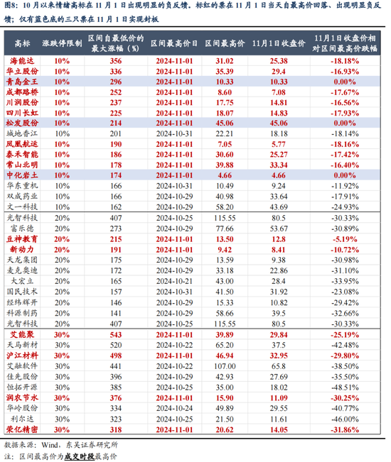 同时,高标风格在月末几个交易日出现了明显的负反馈,或指向短线交易阶段性退潮。统计全部A股区间自最低价的最大涨幅(区间为10.8-11.1,下同),涨幅靠前的为情绪高标。再统计高标票区间最高价(最高成交价)、区间最高价日以及11月1日收盘价。我们发现,大部分的高标票都在11月1日达到了区间最高价,但是当日的收盘价却相较该最高价有明显的回落,这说明许多高标票在11月1日出现了明显的负反馈。