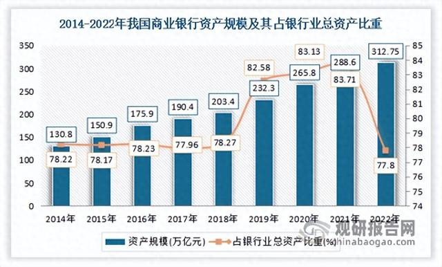 商业银行是我国金融体系的重要组成部分,是实现金融中介功能的主要机构。近年来随着国内国民人均可支配收入得到了提升,高净值人群规模扩大,国民财富提升背景下,国内商业银行吸收的存款越来越多,加上国民财富管理意识的提升等,使得行业总资产规模稳步增长,整体供给能力不断增强。根据中国人民银行统计数据显示,2022年末,中国商业银行总资产规模达到312.75万亿元,同比增长10.99%,占金融机构总资产的比重为77.8%。