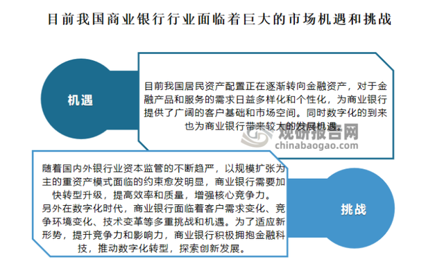 总体来看,目前我国商业银行市场整体平稳。根据相关分析,随着国内经济社会的快速发展,居民收入水平和消费需求不断提高,企业生产经营活动日益活跃,金融市场的深化和创新不断推进,以及数字化的到来,我国商业银行行业也面临着巨大的市场机遇和挑战。商业银行应该把握时代潮流,加快创新发展,提升核心竞争力。具体如下: