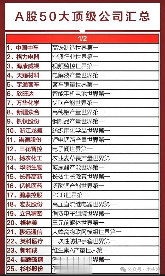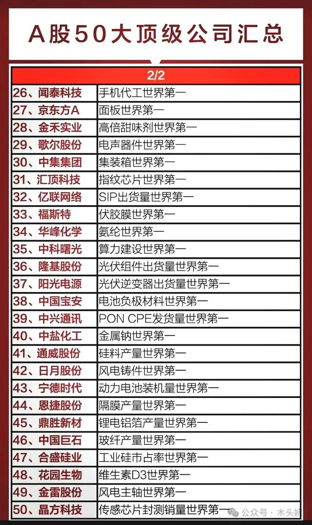 在A股有这么50家上市公司,它们都是各行各业的全球第一龙头企业,代表着中国核心资产!详细名单见文末配图,这里仅列举三两个。
